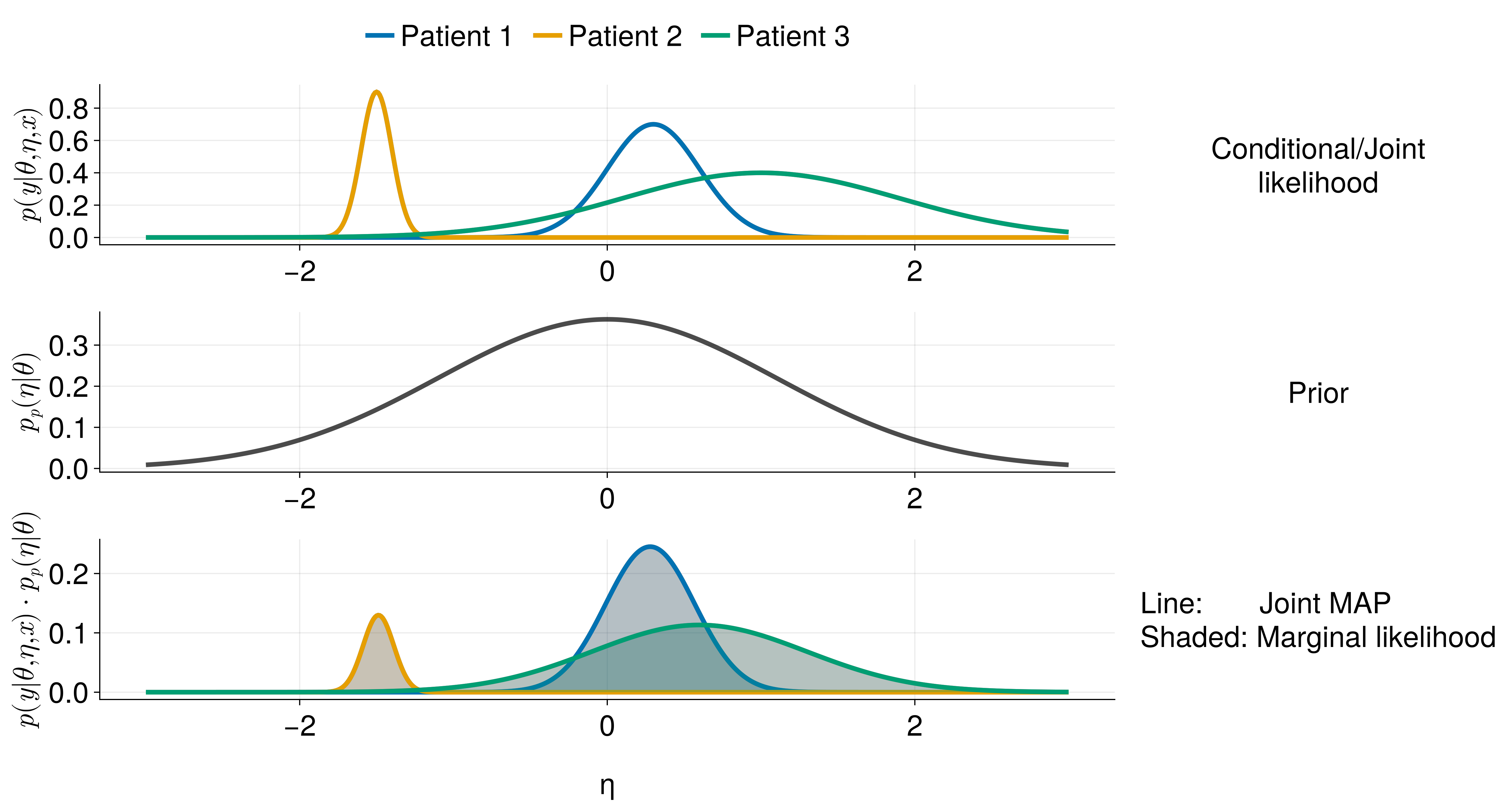 The marginal likelihood is often intractable to compute exactly. \[ p_m(y | θ, x) = \int p_c(y | θ, η, x) \cdot p_{prior}(η | θ) dη \]